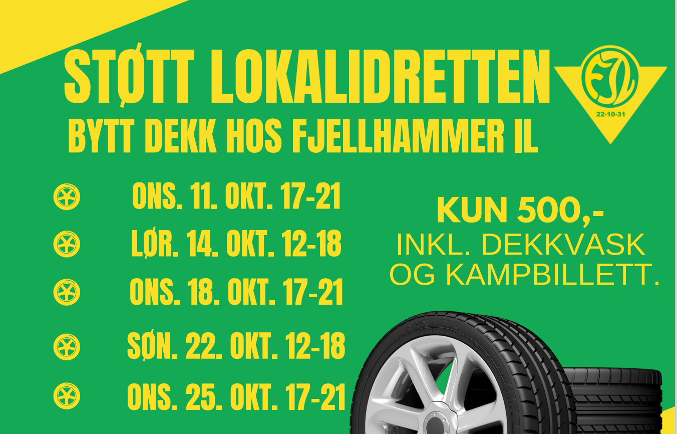 Snart er vinteren her og det er på tide å bytte til vinterdekk! Våre elite gutter og jenter stiller med kyndig veiledning og bytter dine dekk igjennom 5 dager/kvelder i oktober på en trygg måte. Du kan enten bestille time eller ta drop in! Du finner oss i parkeringshuset under Fjellhamar Arena (følg skilting). Her kan du holde varmen mens vi skifter dekk for deg. Det er også veldig kort vei for å få sett litt håndball i mellomtiden. Merk at du får inngang til NM20 kamp for jr gutter den 11 oktober, inngang til Fjellhammer – Haslum HK (Rema 1000 ligaen), Halden (Rema 1000 ligaen) hjemme den 21 og Fjellhammer – Junkeren 18.oktober når du kjøper dekkskift! Du kan kjøpe billett til kamp og for dekkskift i appen nå!